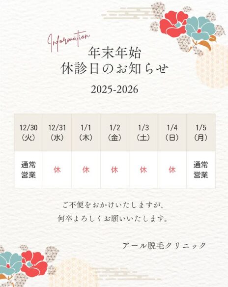 誠に勝手ながら、12月31日(水)から1月4日(日)まで休診とさせていただきます。